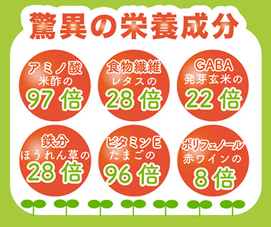 モリンガは、アミノ酸が米酸の97倍・食物繊維レタスの28倍・GABA発芽玄米の22倍・鉄分ほうれん草の28倍・ビタミンE卵の96倍・ポリオフェノール赤ワインの8倍等、合計90種類以上の多種多様の栄養素を保有した栄養素の宝庫です。
