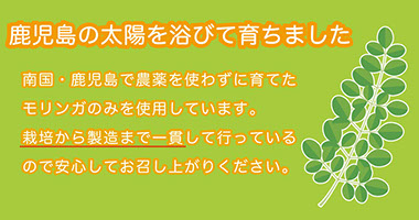 南国・鹿児島で農薬を使わずに育てたモリンガのみを使用しています。栽培から製造まで一貫して行っているので安心してお召し上がりください。